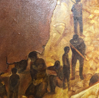 Esta inmensa obra de 10 x 117 pulgadas está realizada en acrílico sobre tela en el 2018, esta obra además de los impresionante que es verla en persona, es como si el artista hubiese visibilizado todas las injusticias y desigualdades que ocurrirían en esta pandemia del Covid 19 desde el 2020 hasta el día de hoy. Entendemos que el artista no tenía el COVID en mente al momento de realizar su obra en el 2018. Pero definitivamente es una obra apocalíptica que representa cómo las fuerzas oscuras de los poderes económicos se apoderan de la sociedad donde la justicia no responde al bienestar de las personas; por el contrario, corresponde a la ventaja y privilegios de aquellos que tienen dinero suficiente para obtener o burlarse de la misma justicia.